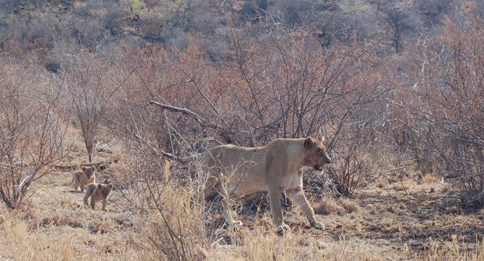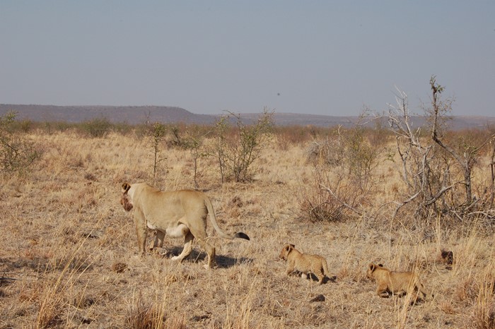 More excitement hit our little corner of Madikwe recently as one of our resident lionesses brought her cubs down from the enselberg Madonna. Myself and the Cheng family were caught totally by surprise as I spotted the two youngsters trailing their mother on the road ahead of us! Johan Marais, from Ngau lodge around the corner, was second on the scene. All the guides at Tau are so proud to be naming the two Cubs and hoping we can honour everyone's expectations.
