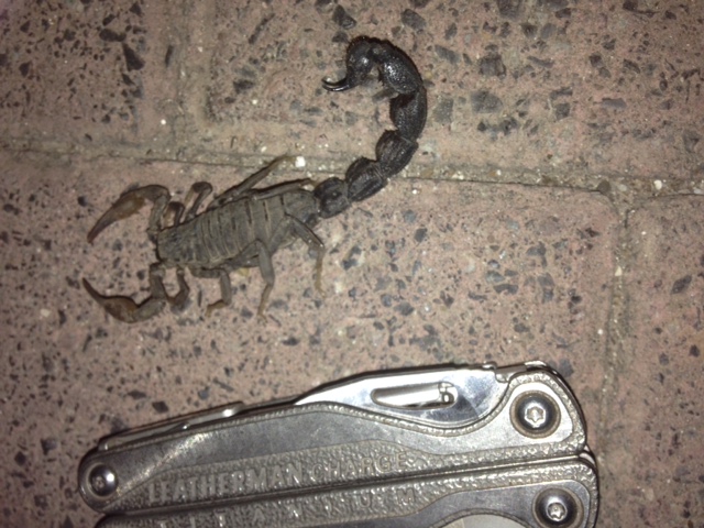 We gratefully received around 52mm of rain (and hail) which started at around 8pm, much of which fell pretty quickly. As the rain was still falling, we started to discover things that we have not seen for a long time through the dry period. We removed a delightful little Red Lipped Herald snake (harmless to humans) from our reception, rescued a young baboon spider from a puddle and also moved this fantastic scorpion from the path close to where the vechicles are parked. It is believed to be from the Buthidae family, judging by the size of the tail, which while not deadly to humans, will certainly give you a nasty sting.
